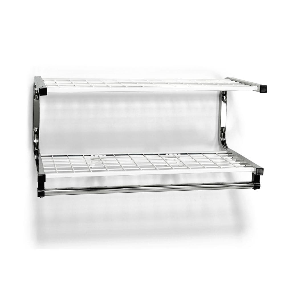Denna klassiska hatthylla i nickel är en tidlös och funktionell lösning för dig som vill skapa ordning och reda i hallen utan att kompromissa med vare sig design eller kvalitet. Med dem vitlackerade hyllplanen i tåligt stålgaller och detaljer i förnicklat kombinerar den en stilren estetik med praktisk funktion. De elegant böjda konsolerna ger hyllan ett lätt och luftigt intryck, samtidigt som den nedre hängstången erbjuder plats för galgar, perfekt för jackor, kappor eller andra ytterplagg. Hyllplanet rymmer smidigt mössor, väskor eller andra vardagliga accessoarer som du vill ha nära till hands.