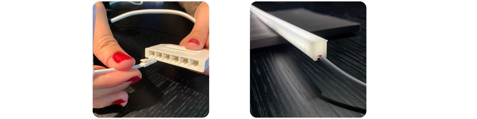 4. Nu ska vi snygga till kanterna genom att montera på ändavsluten på profilen. Dessa klickas lätt i på sidan av profilen. Koppla ihop drivdonet med LED-stripen när du monterat ihop LED-profilen och LED-stripsen med varandra, för att försäkra dig om att allt är inkopplat på rätt sätt. Detta är enklare att göra innan man monterat upp produkten.