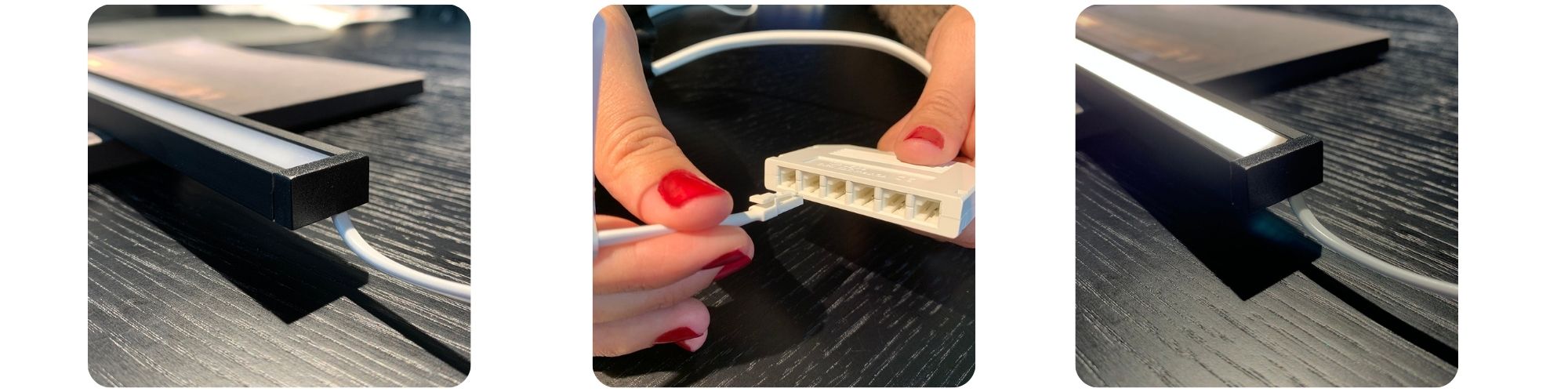 6. Om LED-stripen lyser vid inkoppling är det dags att fästa profilen i fästklämmorna. Koppla ur och klicka där efter lite lätt upp profilen i fästklämmorna.