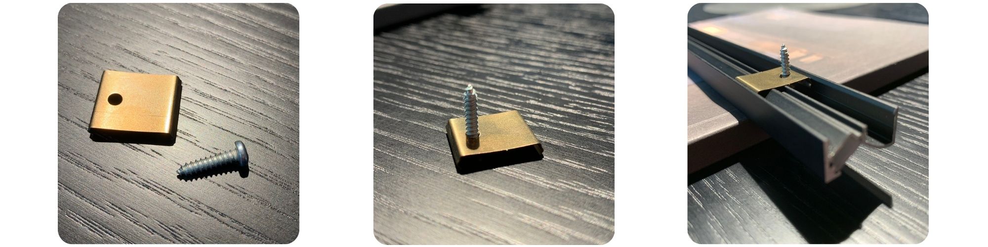 1. Använd montage-kitet som medföljer. De dolda fästklämmorna skruvas upp på önskad plats. För-borra gärna innan för att underlätta monteringen av fästklämmorna. Skruvmejsel är att föredra då det är svårt att komma in med borrmaskin samt känslan man har i händerna är mer skonsam för produkterna.